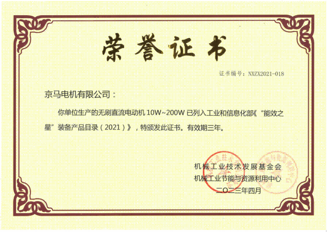4月,京馬電機榮獲《國家“能效之星”裝備榮譽證書》。