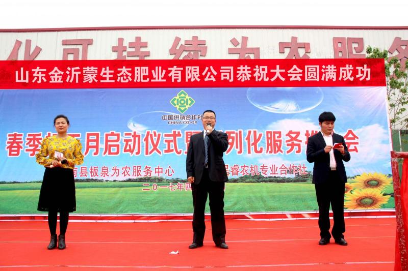 4月16日,莒南縣板泉為農服務中心“春季打工月啟動儀式暨系列化服務推介會”隆重舉行,各鄉鎮農業合作社社長、種田大戶等近千人參加活動,山東金沂蒙生態肥業有限公司副總經理劉仲濤應邀出席并致辭。