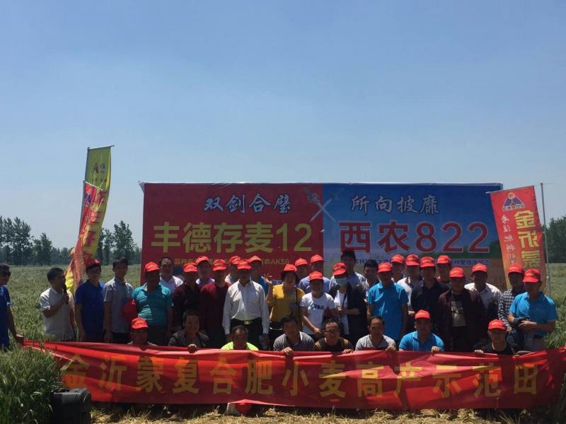 風吹麥浪,麥穗飄香,一片豐收在望的喜人景象。5月16日,金沂蒙復合肥小麥高產示范田觀摩會在亳州市徐格鎮召開, 金沂蒙復合肥的亳州總代理、亳州市天禾農業科技開發有限公司總經理徐永祥、金沂蒙生態肥業有限公司亳州片區業務經理王經富、當地的種植大戶農戶100余人參加。