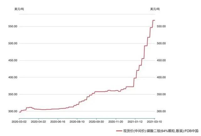 數據顯示,截至3月12日,由中國出口的磷酸二銨離岸價已連續(xù)上漲12周至580美元/噸,較去年同期上漲88.74%。